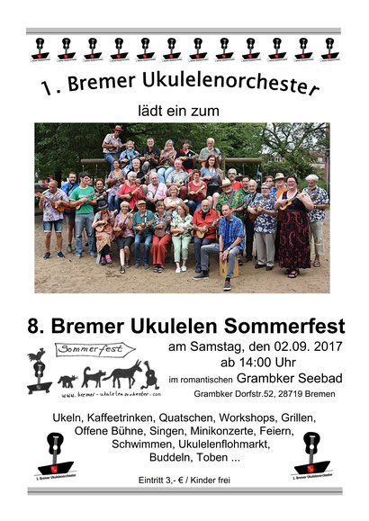 We are happy to announce that it is the 8th edition of the Bremen Ukulele Somerfestival, the best ukulele festival of Bremen, Germany. It’s on the 2nd of september at the Gramber Seebad (Grambker Dorfstr. 52. 28719 Bremen. It starts at 2 o’clock, it finishes late, theres fun and games an beer and food and performance and open stage and lots of ukulele folk – it costs €2 to get in and join in – and of course – the Groningen Ukulele Society will be there – coz we love our sister club – the 1. Bremer ukulelenorchester.
