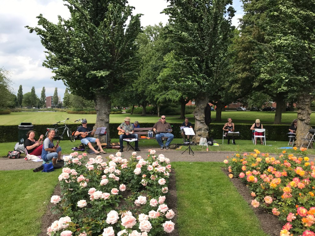We tried a meeting two weeks ago in the beautuful rose-garden of the Pioenpark hwere in Groningen and it went very well. We had lots of fun singing and playing GUS songs and seeing our ukulele friend for the first time in a while. Park visitors loved it and so did we.